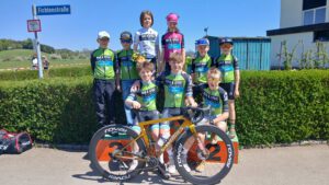 Beim 49. Niederwangener Rennen fuhr der RSV mit 9 Nachwuchssportler/innen in das benachbarte Württemberg. Die Fahrer/innen der Klassen U11, U13 und U15 wollten den Nachbarn zeigen, dass sie am Berg auch ein „Wörtchen“ mitzureden haben. So gingen bei der U11 Oskar mit seinem ersten Rennen überhaupt und Jasmin und Sofia an den Start. Bald schon zerteilte sich das Fahrer/innen Feld am Berg und es kamen einzelne Gruppen ins Ziel. Oskar wurde toller 4., Sofia holte sich den 3. und Jasmin den 2. Platz in der U11. Auch in der U13 waren die Fahrer mit dem grünen Trikot gut vertreten: Josias, Fabian und Julian mussten hier im Gegensatz zur U11 eine Runde mehr – also 3 Runden – fahren und somit 3x den Anstieg bewältigen. Julian erkämpfte sich den letzten Podestplatz und Fabian und Josias Rang 6 und 7. Auch bei der U15 als Trio mit Emil, Willi und Franz vertreten, hatten die RSVler gute Chancen vorne mitzumischen. So war die „orangene“ Konkurrenz aus Wangen auch zahlenmäßig gut vertreten, doch gegen die Attacke von Emil in der 2. Runde hatten sie keine Chance. So gewann Emil nun zum dritten Mal als Solist mit ordentlich Vorsprung bevor die Verfolger die restlichen Plätze unter sich ausmachten. Franz holte sich dann noch den 5. und Willi den 6. Platz.