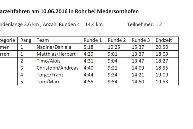 12 Fahrer und somit 6 Teams nahmen am Paarzeitfahren teil. Hier die Ergebnisse der super Leistung