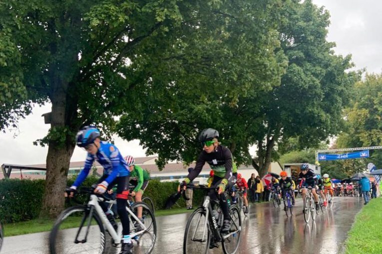 Beim Rundstreckenrennen in Leutkirch – Wuchzenhofen waren trotz der windigen und regnerischen Wetterbedingungen zahlreiche Nachwuchsfahrer am Start. Beim 1. Schritt Rennen und den Klassen U11 und U13 waren geschätzte 40-50 Teilnehmer am Start. Den Anfang machten die Fahrer der U13 mit 5 Runden a 3 km. Die Runde mit einem moderatem aber Gegenwind gerichtetem Anstieg forderte insbesondere ein geschicktes Fahren. Wer zu viel im Wind fuhr oder bei den engen Kurven abreisen ließ, verspielte seine Kräfte. Bei der U13 mussten diesen Bedingungen Ben, Felix und Simon trotzen. Bereits zu Beginn formierte sich eine 6 köpfige Spitzengruppe, in der auch Felix vertreten war. Diese blieb bis zum Schluss zusammen und machte den Sieg im Sprint unter sich aus. Hierbei fuhr Felix als Erster um die letzte Kurve ca. 200m vor dem Zielstrich. Doch die 200m mit Seitenwind waren dann doch einen „tick“ zu lang, sodass er knapp auf den letzten Metern von seinem Konkurrenten aus Öschelbronn Oskar überholt wurde. Dennoch ein Klasse Zweiter Platz. Auch Simon und Ben kämpften tapfer gegen den Wind, da sich der Rest des Feldes dann zerriss und kamen als 13. und 15. ins Ziel.