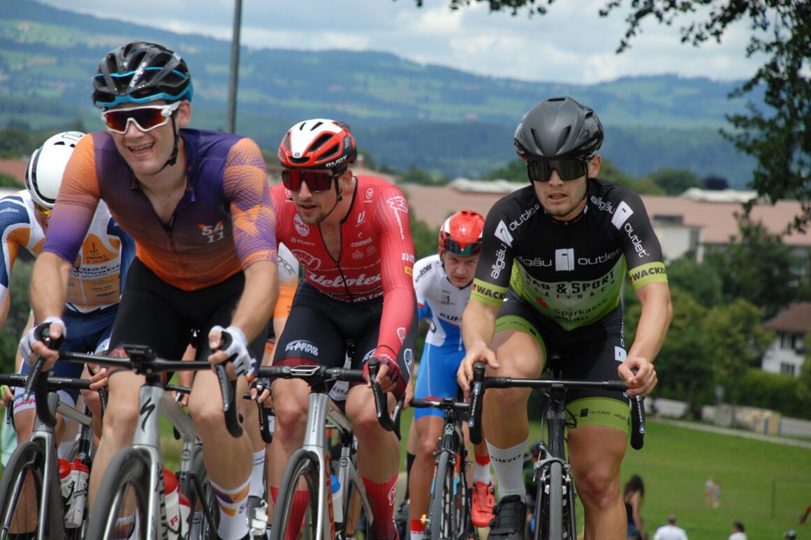 Beim Elite Rennen war der RSC Kempten in der Anzahl der Fahrer überlegen und eigentlich klar der Favorit. Gerade Jonas Schmeiser als Hauptfavorit, der auch noch an diesem Tag 34 Jahre wurde und einen Champagner überreicht bekam, hoffte heute hier im südlichen Allgäu dem Rennen mit seinem Team den Stempel aufzudrucken. Auch hier war das Starterfeld hochkarätig. Bei den Elite Fahrern blieb das Hauptfeld dann doch länger zusammen, da einfach viele Fahrer wussten auf welch „ehrliches“ Rennen – so die Bezeichnung des späteren Zweitplatzierten Wollenberg – sie sich einließen. Damit meinte Wollenberg den anspruchsvollen Rundkurs, bei dem sich keiner im Windschatten verstecken kann. Bergauf wird klar nach der Stärke der Beine selektiert. Doch zu einem späteren Zeitpunkt machten die Favoriten Dampf und es setzte sich eine 3 köpfige Spitzengruppe mit Schmeiser, Fischer und Knauer ab, gefolgt von weitere Favoriten, wie Wollenberg und Schmieg. In der vorletzten Runde gab es dann den Zusammenschluss der Favoriten und es ging in den letzten Anstieg. Es war Florenz Knauer vom Team 54×11, der das Zepter in die Hand nahm und einen Antritt startete, den keiner folgen konnte. So kam er solo auf der Zielgeraden an und ließ sich als Gesamtsieger des 9. Andreas Brandl Gedächtnisrennen feiern. Im Sprint konnte dann der 21 jährige Wollenberg den Routinier Christopher Schmieg vom RSC bezwingen. Bei Wollenberg von den Maloja Pushbikern war der Sprecher überzeugt, dass er es noch zu einem Profi schaffen kann. Er war dem hohen Tempo der Älteren mächtig und konnte sogar am Ende auch noch dominieren. Die drei Erstplatzierten wurden gefolgt von Fischer Robin und Jonas Schmeiser.